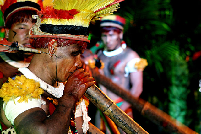 Xingu Indian flute ceremony being performed for an audience in Sao Paulo,